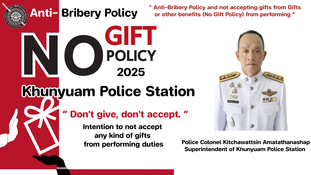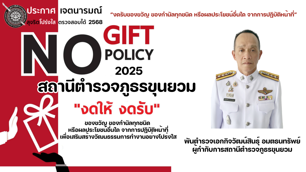 - ประกาศสำนักงานยุทธศาสตร์ตำรวจเรื่องเจตนารมณ์ที่จะไม่รับของขวัญหรือของกำนัลทุกชนิดจากการปฏิบัติหน้าที่